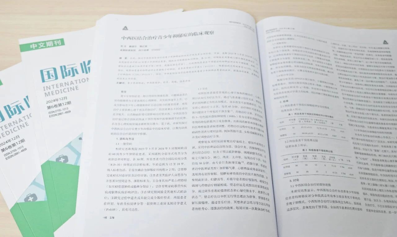 近期,成都棕南医院精神卫生中心研究团队主要成员樊红菊医生合作撰写的学术论文《中西医结合治疗青少年抑郁症的临床观察》在《国际临床医学》(国际标准刊号ISSN:2661-4839)正式发表!
