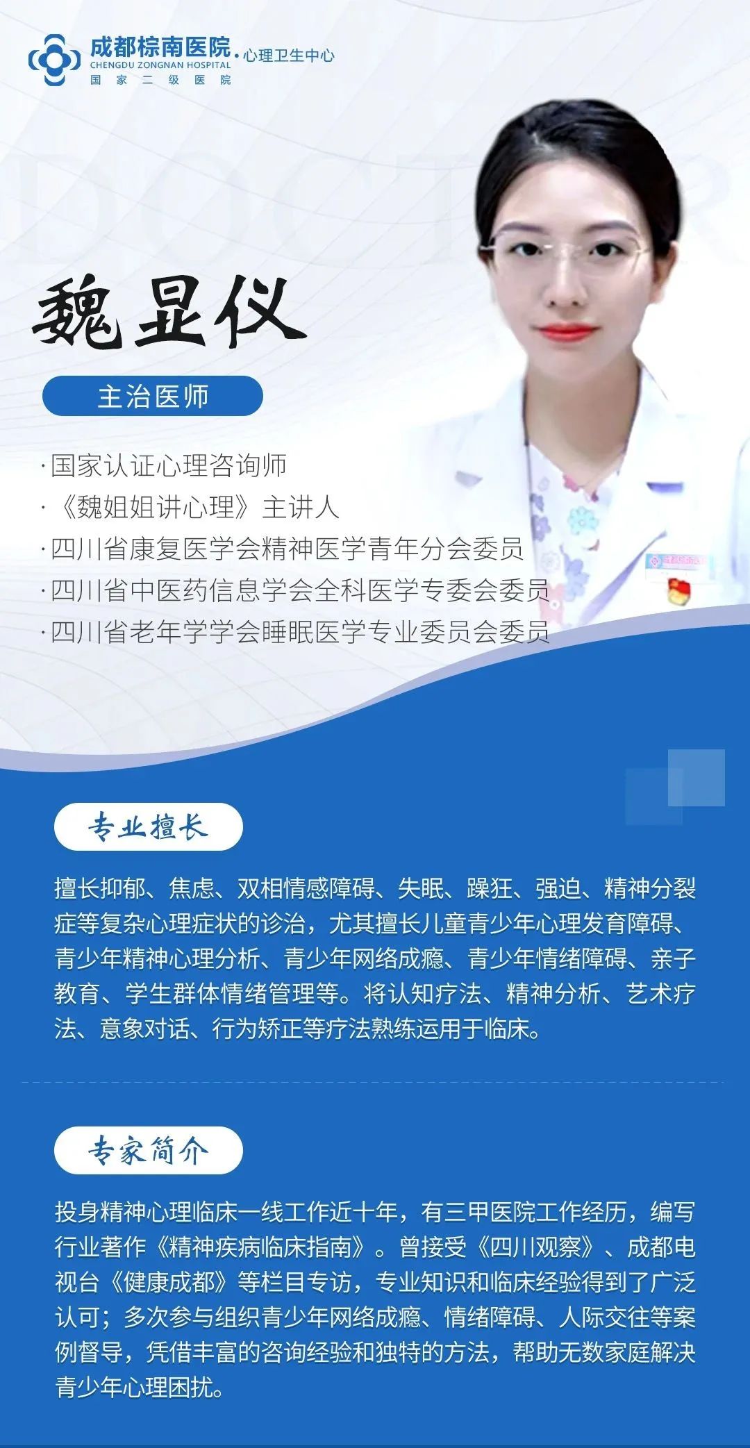 在国家大力推进精神卫生服务体系建设,支持医院精神(心理)科建设,倡导提升全民精神健康水平的政策背景下,成都棕南医院积极发挥精神心理专科优势,以搭建魏姐姐精神心理团队为契机,为患者提供更优质的医疗服务。