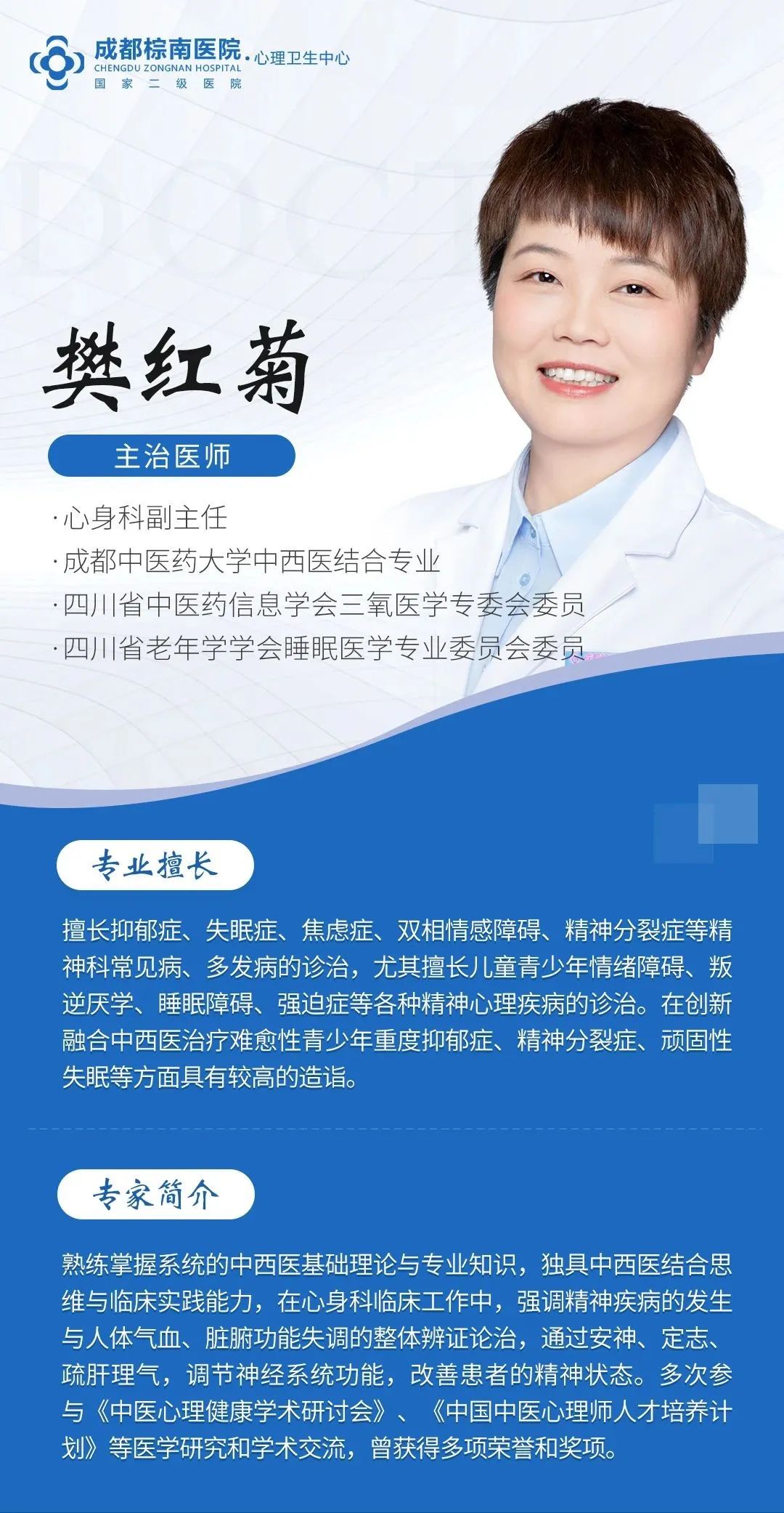 为进一步强化团队精神心理诊疗实力,邀请前四川省人民医院精神医学中心专家李明美加入魏姐姐精神心理团队,强强联合,医术共融,让患者在家门口享受到优质、科学、便捷的医疗服务。