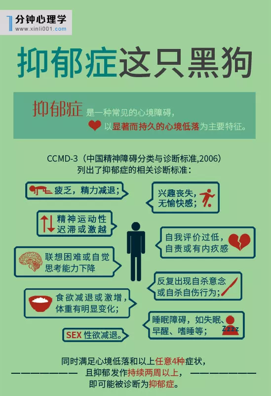 所以,抑郁患者不是矫情,患者不仅要承受精神上的折磨,如焦虑,喜欢胡思乱想,总觉得自我评价降低,思维迟缓,注意力不集中,严重的会有自杀的想法,还要承受来自躯体上的多种不适。
